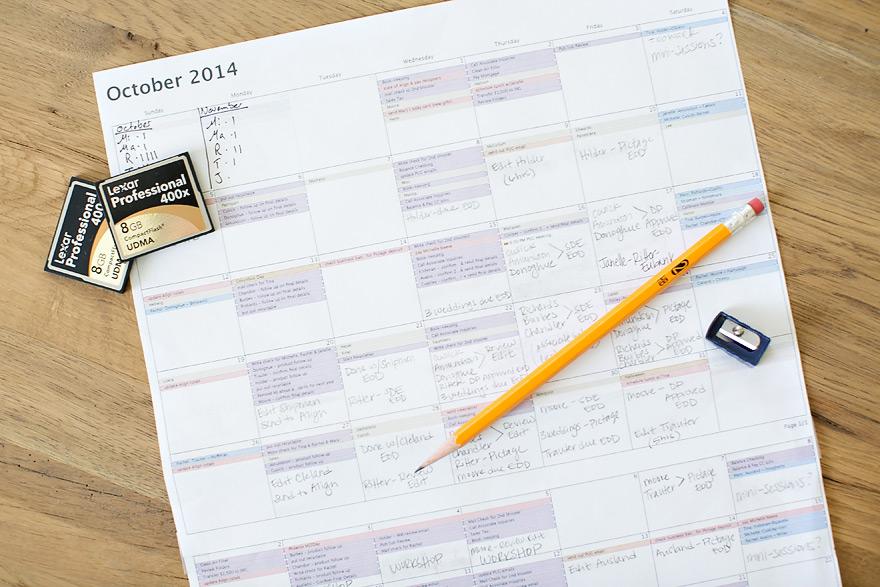 Our turn-around time goals are pretty ambitious. For my weddings, we shoot to get all the proofs online within one week, and for our associate weddings, we promise three weeks but shoot for two weeks. Suffice it to say, we’re having to employ some serious strateg-ery (made up word) to have any hope of keeping up with our deadlines. We printed off our iCal for October/November and took a pencil to it to plan out exactly what needs to get done each and every day in order to meet our goals. Since our associate photographers don’t do any color correction or editing (they only cull & FTP to us), the studio has to process each wedding, deliver products, and send images to vendors. It’s A LOT.