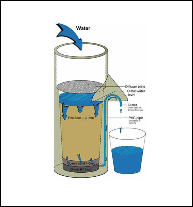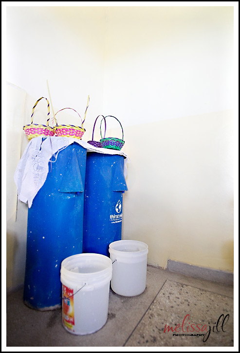 We learned a lot about these filters while we were there and even got a chance to help make them ourselves one day! Each filter costs $80 to make and brings clean drinking water to an average of 15 people. They are very simple in structure and consist of a concrete mold that houses a PVC pipe that brings the water from the bottom of the filter up to the spout you see sticking out over the buckets. When water is poured into the top of the filter it goes through a number of layers before reaching the piping at the bottom. The first is a diffuser plate with holes in it that filter out any large chunks. Next comes a large layer of fine sand. The top few centimeters of the sand trap the bulk of micro-organisms, which accumulate and develop into a highly active food chain, called a bio-layer. The bio-layer traps and feeds on the micro-organisms and contaminants in the water. Further filtration occurs in the lower layers of sand and gravel before the filtered water, that has been tested to be 99% bacteria-free, comes out the pipe. Wa-laa! No breakable parts and no filters that need to be changed. Genius: