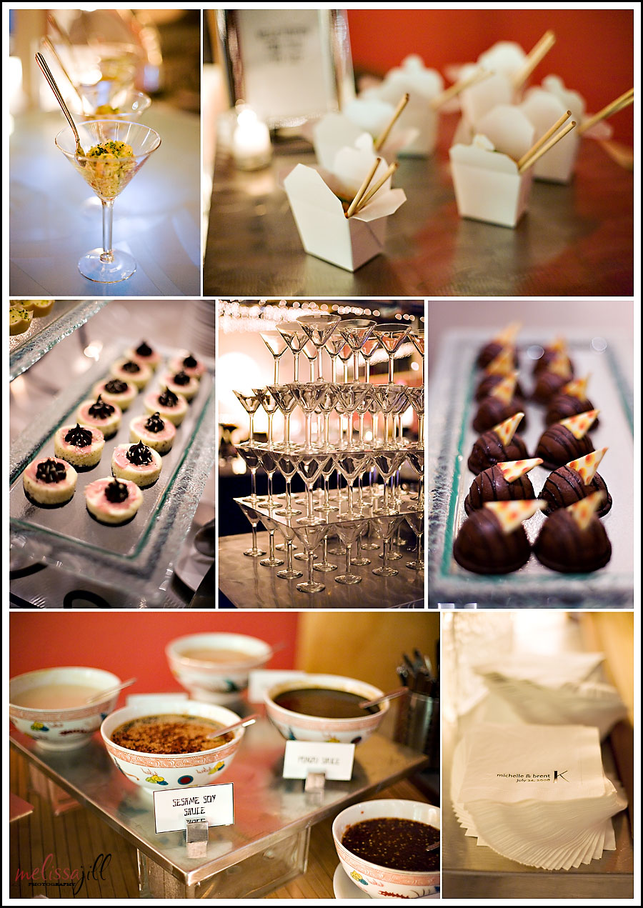 Michael's Catering did the food and the presentation was mouth-watering. There were four stations--one with midwestern food (since Brent is from Iowa), one with southwestern food (since Michelle is from AZ), one with Thai food (since their relationship's beginnings were on a mission trip in Thailand) and one with desserts.