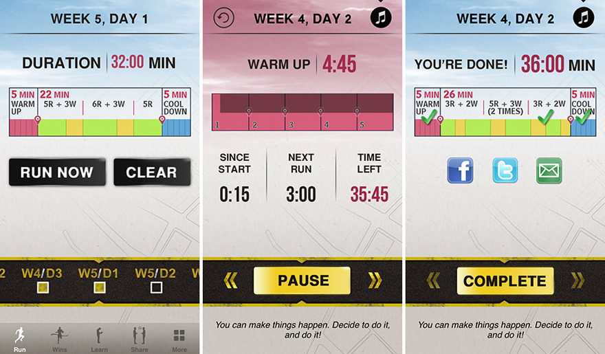 The app has 8 weeks worth of runs -- 3 per week -- that incrementally work you up from sitting on your couch doing nothing, to running a 5K. You start by alternating running and walking often, and then the walking slowly subsides over the weeks as the runs become longer. I love it because it gives me a tangible goal and I am able to push myself to achieve more because of it.
