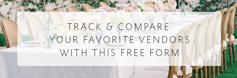 -----------> If you are caught up in the whirlwind of selecting your wedding vendors, click here to download a FREE form to help you through the decision-making process! We've created a convenient form to help you track and compare your top 3 vendors in each category. Download your FREE copy today!