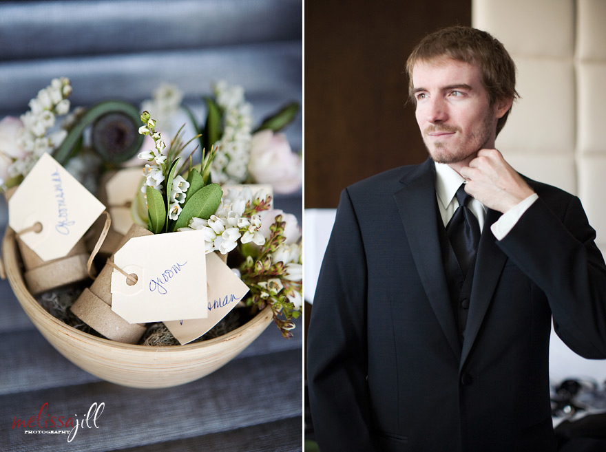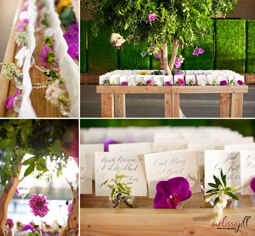 The details for this wedding were all conceptualized by Victoria Canada -- one of my favorite coordinators -- and they were gorgeous. Going with the theme of "urban garden" the seating card display was a custom table built around a 9 foot Manzanita tree right in the lobby of the museum.