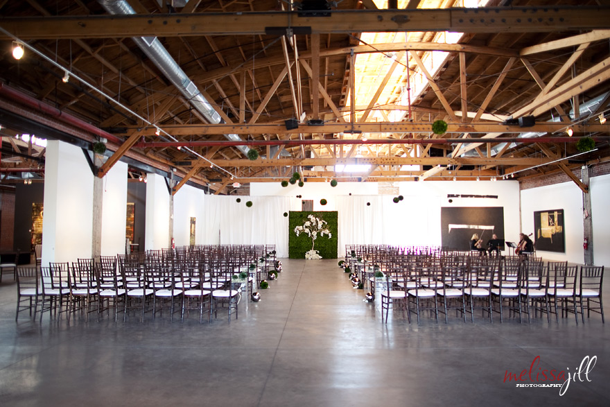 The ceremony set-up was AMAZING. The ceremony backdrop was an 8x6 foot boxwood covered with Manzanita tree branches and assorted floral. Moss spheres hung from the rafters above the ceremony chairs.