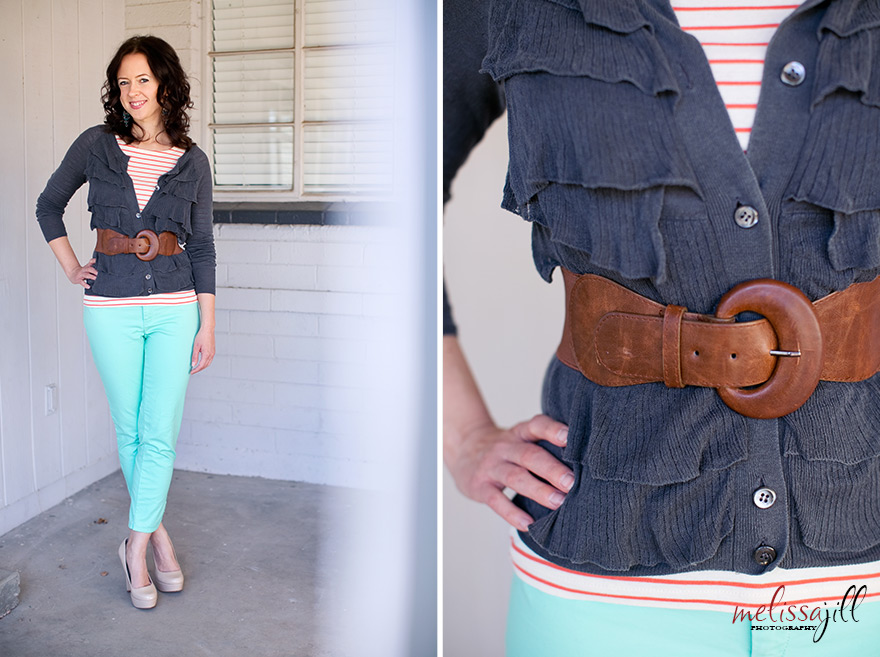 Favorite Outfit of the Week: Striped top & ruffle cardigan: J Crew / Mint cropped pants: Anthropologie / Belt: Urban Outfitters / Nude heels: Aldo / Earrings: gift from a friend