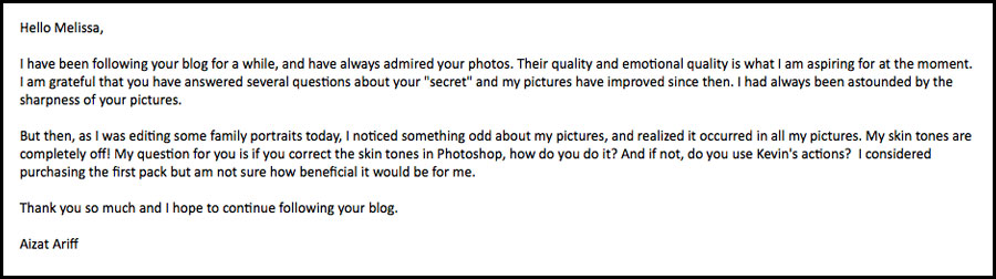 My next f.a.q. from a photographer comes from Aizat. He asks a great question about skin tones. I do have some strong opinions on skin tones. I know that the choices photographers make in this area can be somewhat subjective but in my subjective opinion, they should look as natural and clean as possible. Unfortunately, as I scan through some blogs out there I grimace at some photographers' color correcting choices. In this area, I think actions have hurt us more than they've helped us. We think that we can just run an action that we like on any photo and it will look good. Not so much the case.
