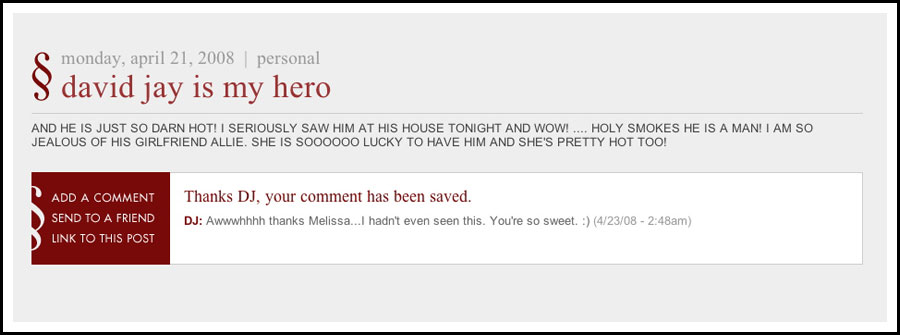 I've been friends with David and his family for years but I gotta tell you, I feel a little violated after last night. After most everyone had left I was chatting with David and Todd about features of my blog that I love and innocently offered to show them my backend. The backend of my blog that is. I forgot to log out and left around 12:30am. When I got home I found this posted on my blog: