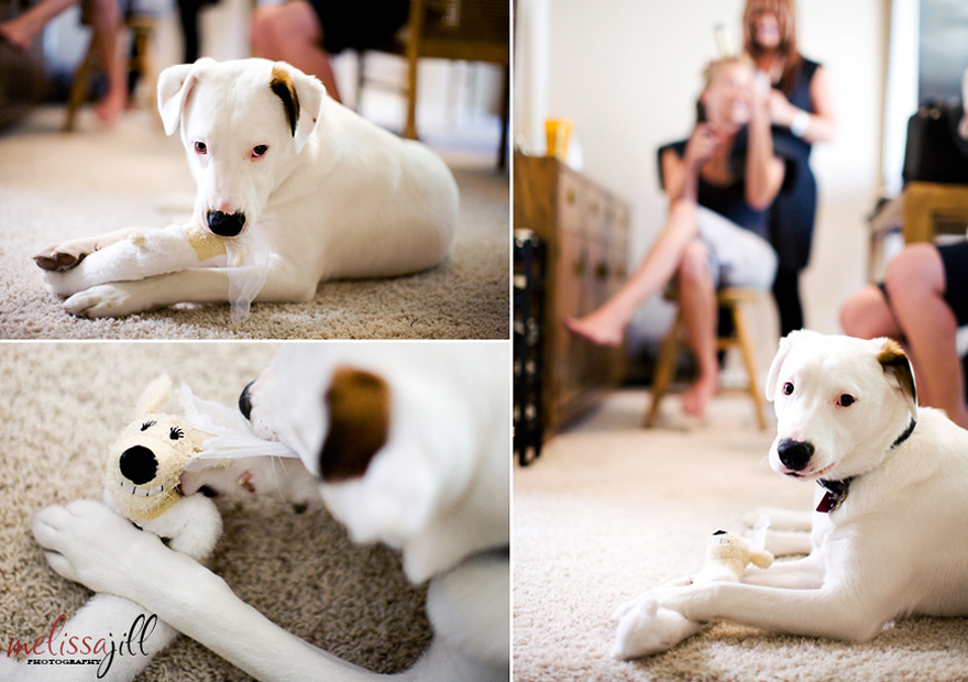 Toby, Abby's mom's puppy, stole the show most of the morning. He thought the party was for him. He got a new toy in honor of the day and the poor little bride-dog didn't last long: