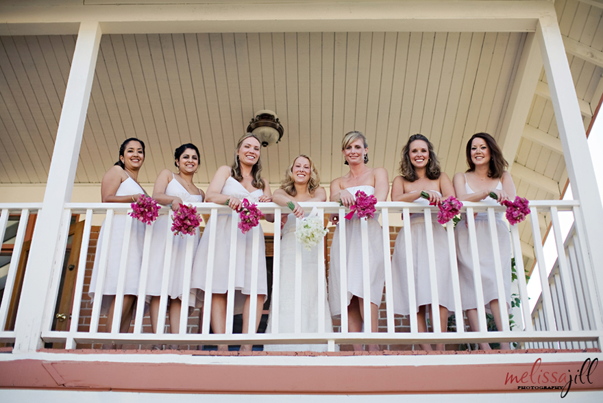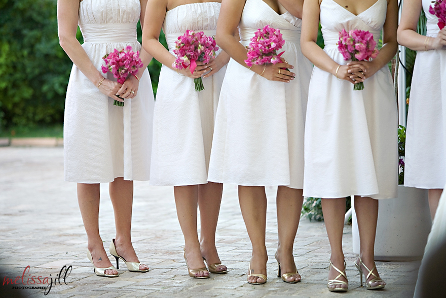 The bridesmaids wore tan and white stripped dresses from Twirl & the guys' ties were made of the same fabric as the dresses: