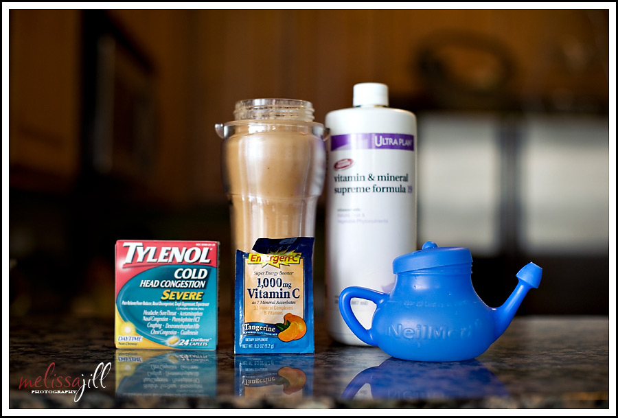 Being a self-employed wedding photographer makes it pretty much impossible to put my life on hold to get well. Weddings are non-negotiable. I'm showing up unless I'm dead on the side of the street or physically chained to a hospital bed. I'm also committed to showing up for portrait shoots. There's no better time to reschedule during busy season and clients put a lot of work into preparing for them. But my strategy when sick is to put off everything else that isn't essential in favor of rest and beating my nemesis FAST. I employ some powerful weapons in the fight -- many of them shown in the photo above. It's funny when I post about being sick on Facebook or Twitter, I inevitably get a slew of comments with everyone's favorite remedy. Apparently there are a gazillion that I haven't tried that are foolproof.