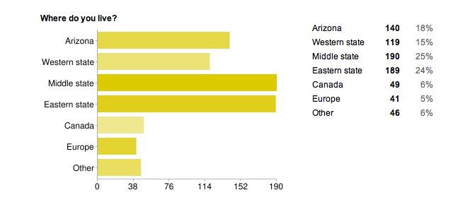 Those who fell in the "other" category are mostly from Australia and Asia with a few from Central America, South America and the Caribbean. Those of you who thought Texas should have its own category -- sorry to disappoint. I put you in the "middle state" category :). But you get extra points for having the most state pride :).