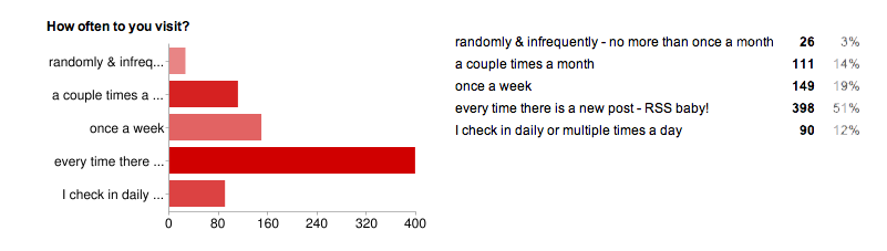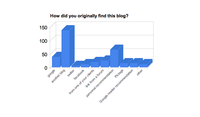 The next question was open-ended because I wanted to hear any of your stories about how you originally found my blog. I speak on blogging quite a bit and many newer bloggers want to know how to get people they don't know reading their blog. The web is a crazy place and most of the time you don't know how people find you. But the answers to this question shed some light on how those connections might work. Many of you couldn't remember how you first came across my blog, but for those of you who could, these were the results: