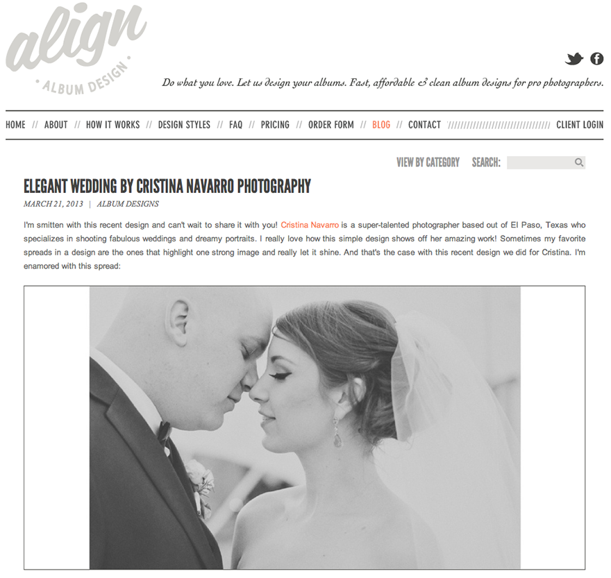 I post once or twice a week on the blog and share tips and tricks relating to album sales, some of our favorite recent designs, news about Align, and occasional guest posts by some of our clients. This week Melissa Arlena, one of our favorite clients, shared on the blog about how she uses Align to make her clients happy AND increase her profit. Pretty cool!