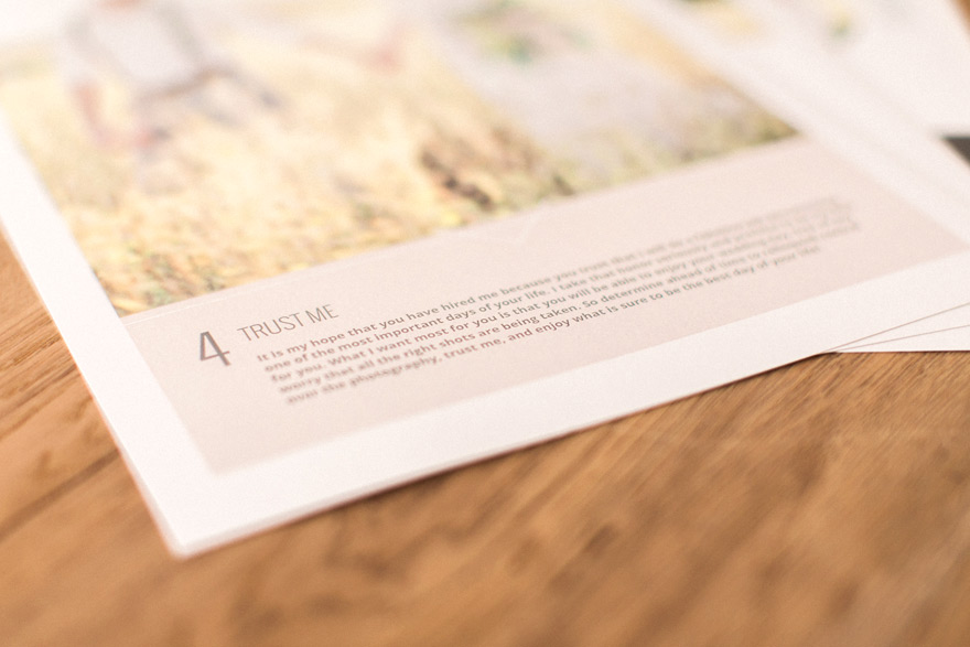 I work very hard to build trust with my clients because I know how scared they can be and how close this purchase is to their hearts. One of the reasons I have a blog is to build that trust over the long-term with potential clients. I want them to see the consistency in my work. I want them to see how involved I am in the industry. I want them to learn about my character and even a bit about my personal life. They deserve to know these things so that they can put their faith in me. I take the honor of photographing someone's wedding very seriously and know that part of my job is to make it as easy as possible for a client to trust me. I'm asking for a lot by asking for their trust. But trust is crucial in this relationship and I do my job to earn it.