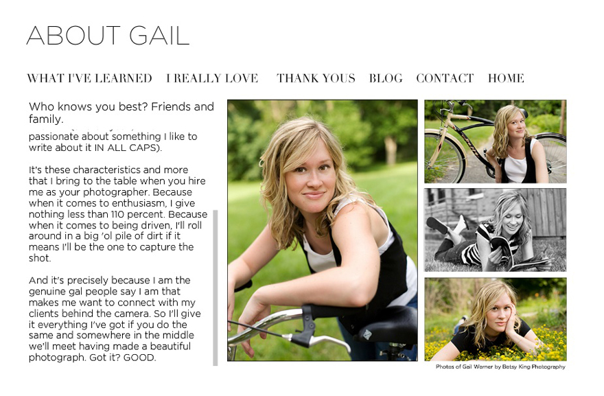 We get photographers at all stages of their businesses at the MJ2Day and Gail was a relative newbie when she came to the workshop -- having just a few weddings of her own under her belt. She was part-time at the time, and continues to work outside of her photography business to this day because she can't part with her other job as the Media Relations Manager at Ball State University. She's a mulit-talented girl with lots of interests including reading (SO many of my favorite recent reads have been her recommendations), writing, and cooking.