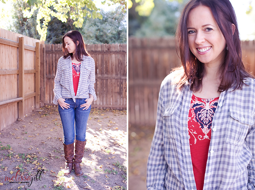 Favorite Outfit of the Week -- Printed tee, button down & skinny jeans: Lucky / Boots: Cathy Jean
