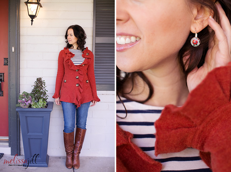 Favorite Outfit of the Week: Striped shirt: Boden / Rust ruffle jacket: Anthropologie / Skinny jeans: Lucky / Boots: Nordstrom / Earrings: Haven Boutique