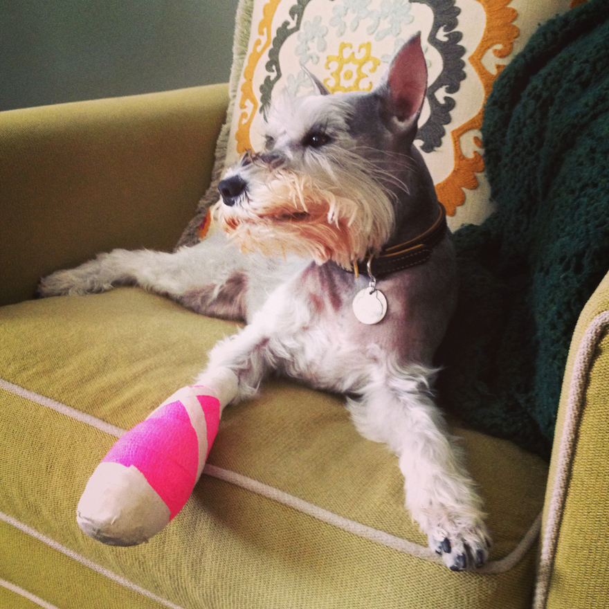 I flew in Monday night after two weeks away from this cutie, and as I'm getting in the car at the airport, my mom says, "Now, don't freak out when you see your dog...." So I didn't. Outwardly, anyhow. My sweet mom has always groomed Dixie and the night before, as she was trimming the hair around her paw, she accidentally cut off the skin on one of the joints on top of her paw... down to what looked like the bone. Thankfully I didn't see the bone when I got into the car that night. My mom is a nurse and had bandaged it up a bit. But I did see it later that night and my heart welled up with pity for my sweet girl who just 3 weeks ago had 16 of her teeth removed. She really seemed fine though -- I don't think she was in pain. I'm not sure if this is why it took me a full 24 hours to decide to take her to the vet, but thankfully I did Wednesday morning. The vet told me that what I thought was the bone was in fact a tendon, and that it was a good thing that it was still intact. Then he put medication and this gigantic impenetrable bandage on her leg that she has to wear for a full week, and sent me home with antibiotics. Her second round of them this month. As you can see in the above photo, she is a bit perturbed with her giant pirate leg and is not at all appeased by the fact that the vet tried to make it "girly." But it looks way worse than it is and she'll be alright. It's pretty funny to watch her hobble around on it though. She can't decide whether to hold it up and make due with three legs or to gimp along on it trying to compensate for the fact that it's longer than the others. So she alternates between the two options. :(