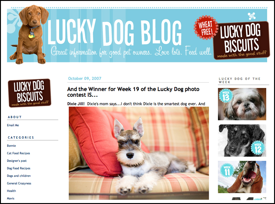 Yay!!! I sent in Dixie's photo to the Lucky Dog Photo Contest a couple weeks ago and she's this week's winner! So exciting! All we won were some yummy dog treats but I mostly just wanted to show off her cuteness to the world :). If you'd like to see the blog with the full article, click here!