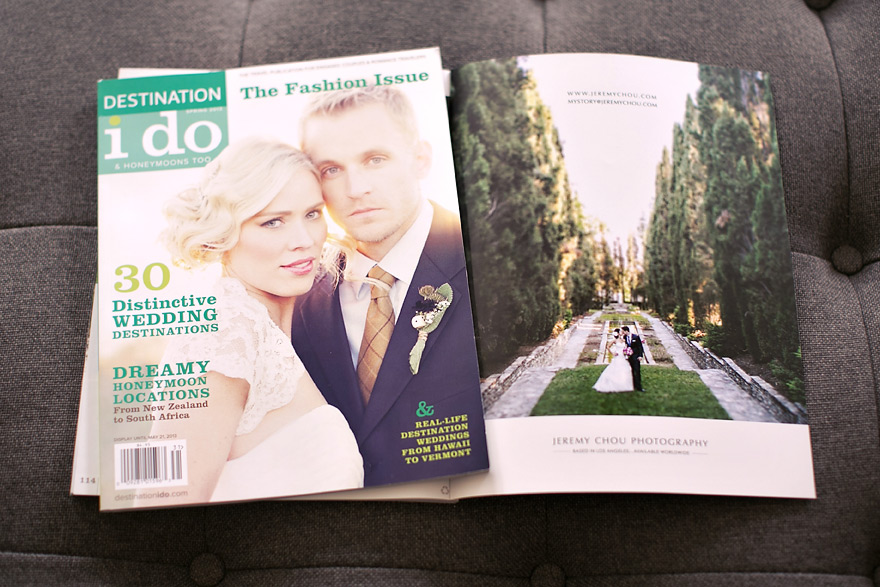 A: MJ & her super-cool workshop sponsors gave away some AMAZING prizes at the workshop. I received a full page advertisement, yes, you read that right, a FULL page ad in the Spring 2013 issue of Destination I Do Magazine! Destination weddings have been a pretty successful market sector for me, and it was great to be able to win a free advertisement on one of the most well-known magazines out there! Thanks MJ!