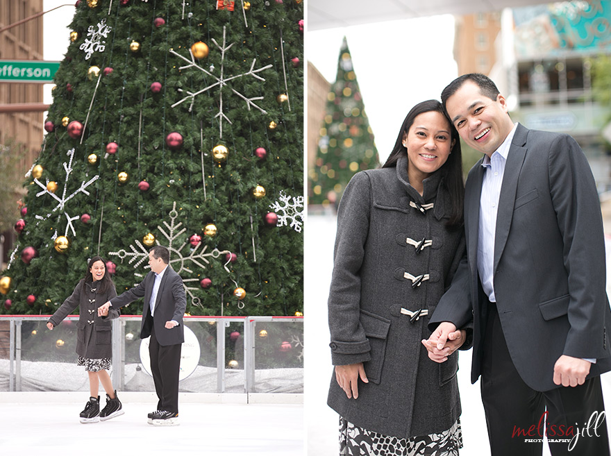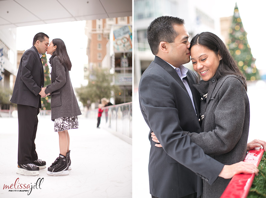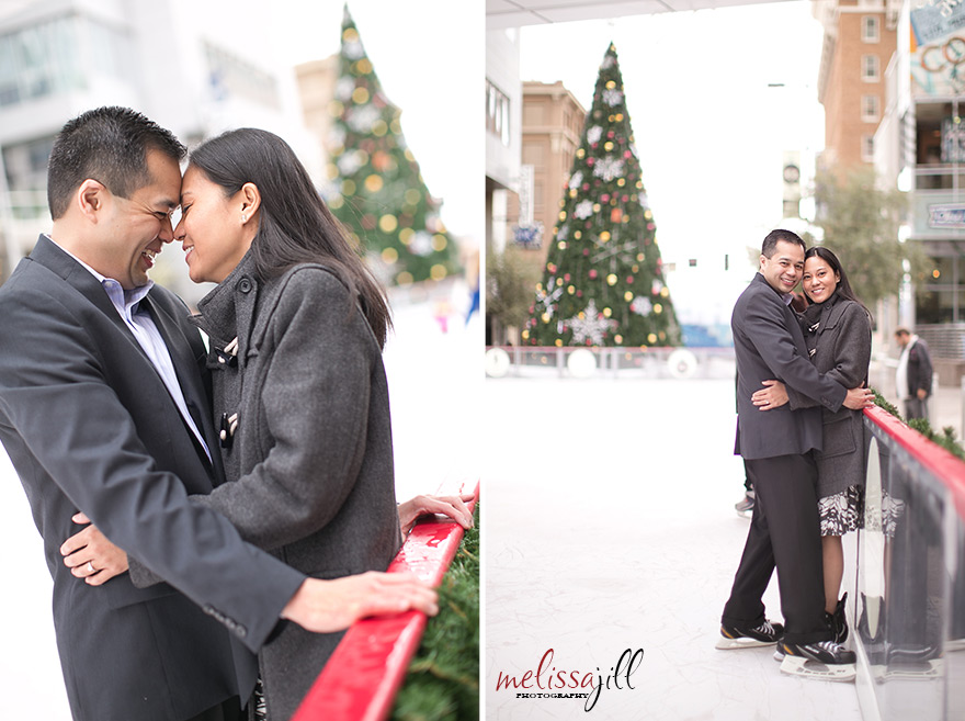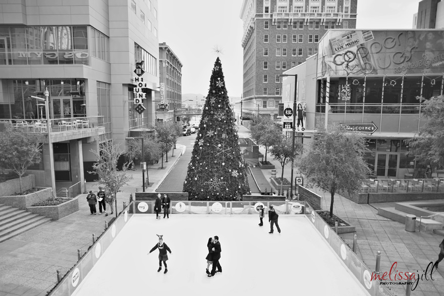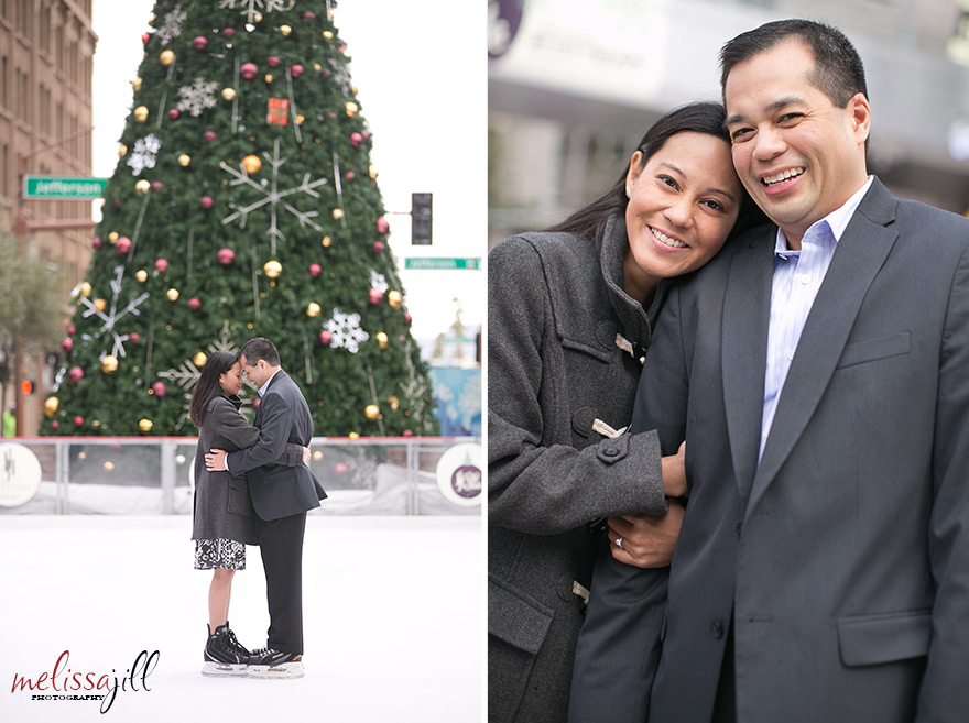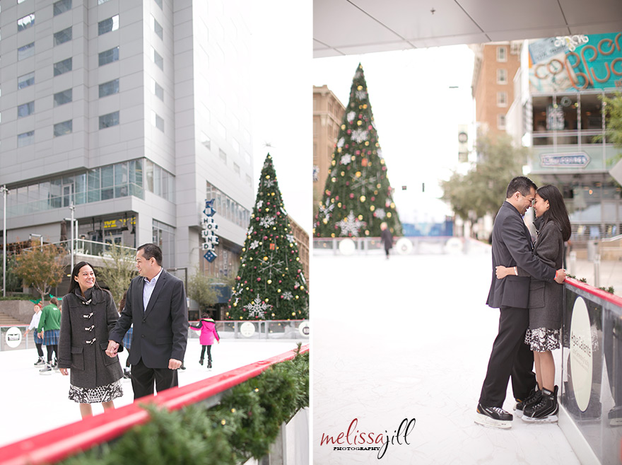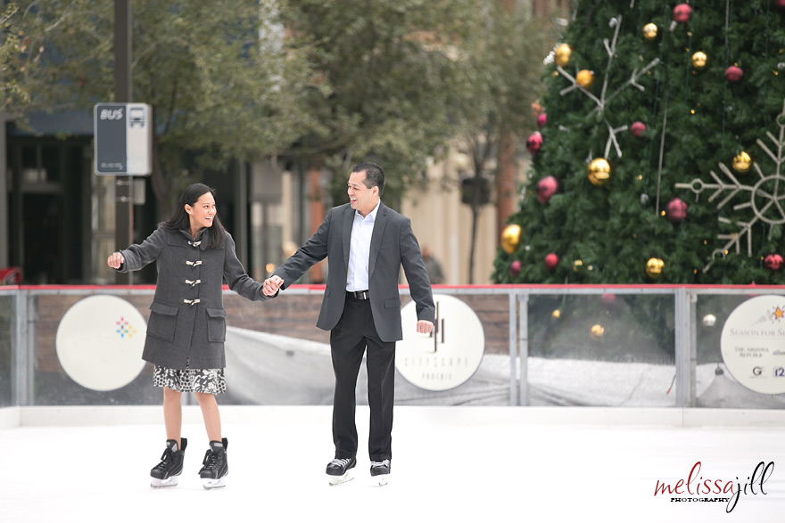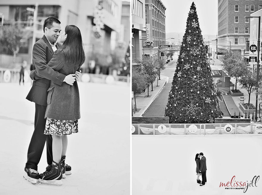 I knew I was in love with Peter and Marie when they said they wanted to do their engagement shoot on the temporary outdoor ice rink set up in the middle of Central Avenue in downtown Phoenix.