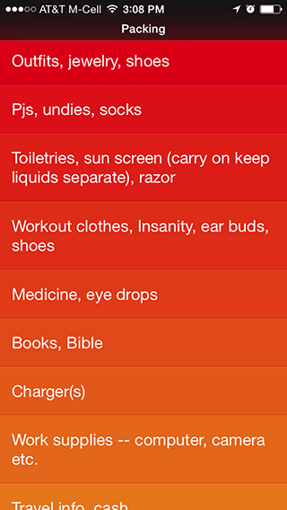 -Packing List. This has to be one of my very favorite uses for this app. Packing. I hate packing. I open an empty suitcase and the energy is instantly drained out of me. It takes me forever to remember everything I need and then no matter how hard I try, I inevitably forget something. But Clear is a perfect solution because every time I pack I have to think through the same categories, so keeping a constant crossed off list that I can pull back to start fresh each time is great. Then if I forget something, I just add it to the list (or tweak the wording of the list) to make sure it doesn't happen again. I even have TO DO items on it that always need to be done before I go out of town. This is my Packing list in Clear: