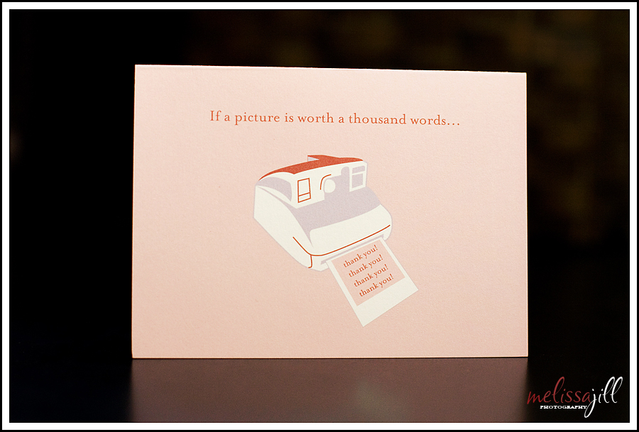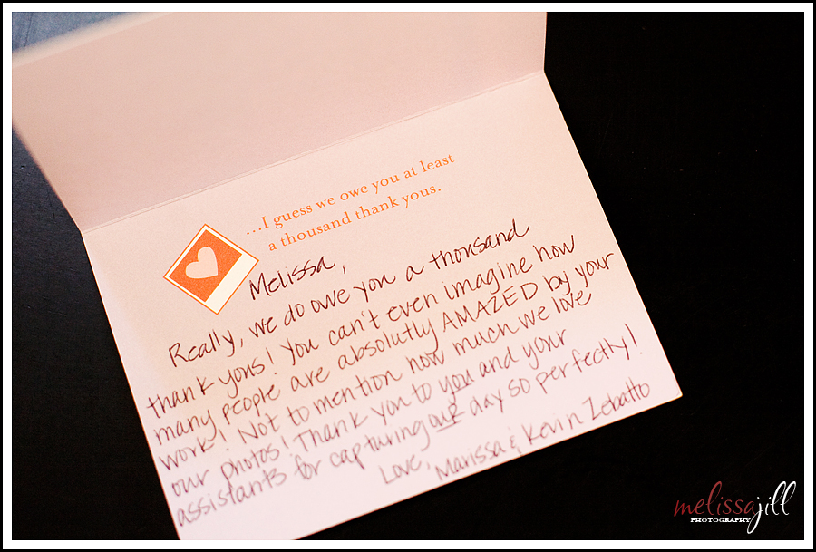 I get sweet cards from many of my clients -- even Christmas cards from couples whose weddings I shot years ago (Thanks!!) -- and I appreciate them all SO much. I save each and every one and really appreciate you taking the time to write a note about your experience. I just got this particular card from Marissa and Kevin and couldn't believe how cute it was! It's like it was custom made to thank a photographer! I really felt the love.