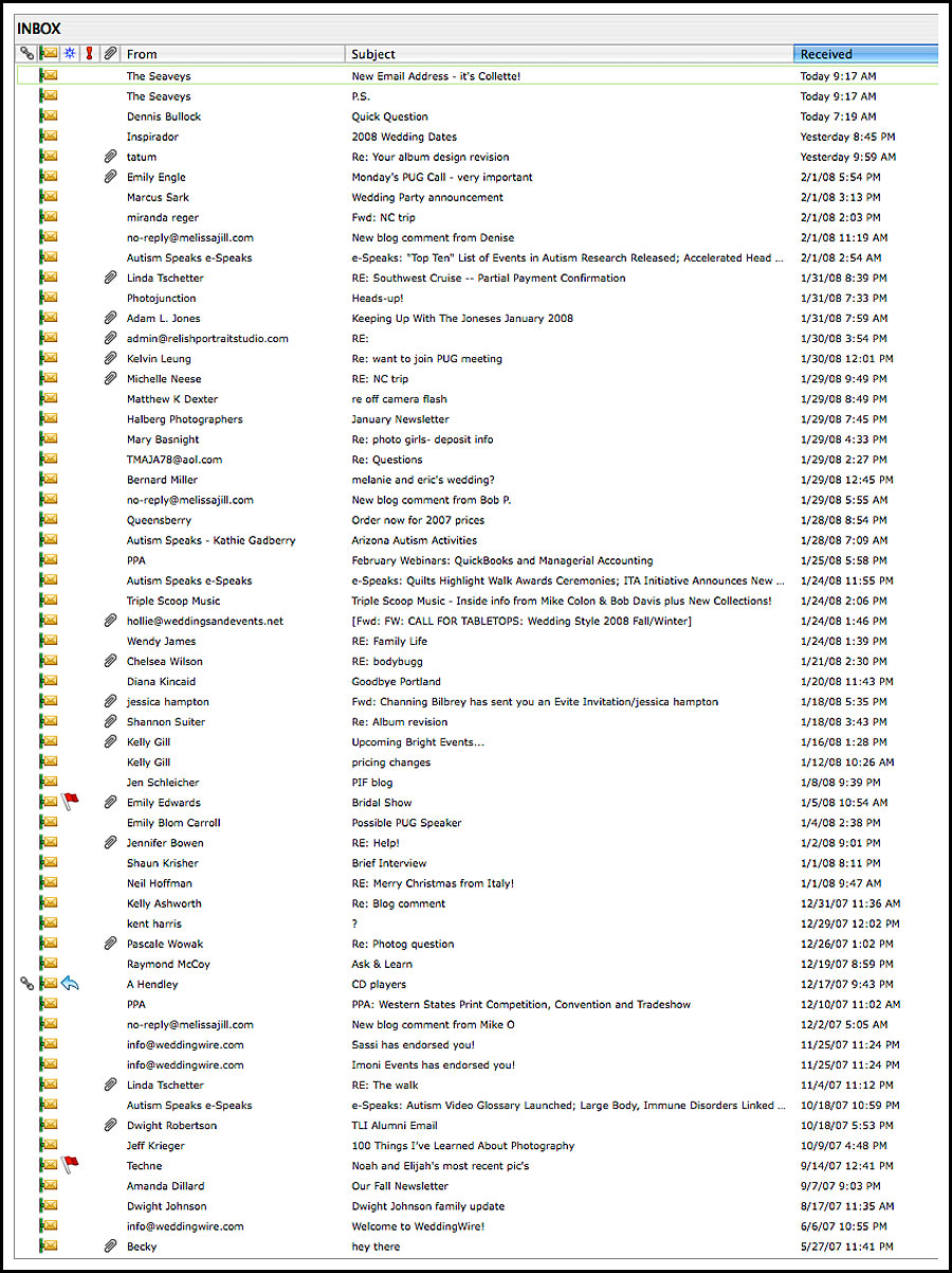 Thanks for all the tips on organizing into folders. I forgot to mention that I actually have quite a complex and organized system of folder management. The emails in my inbox are only emails that I need to still respond to in some way--yikes.