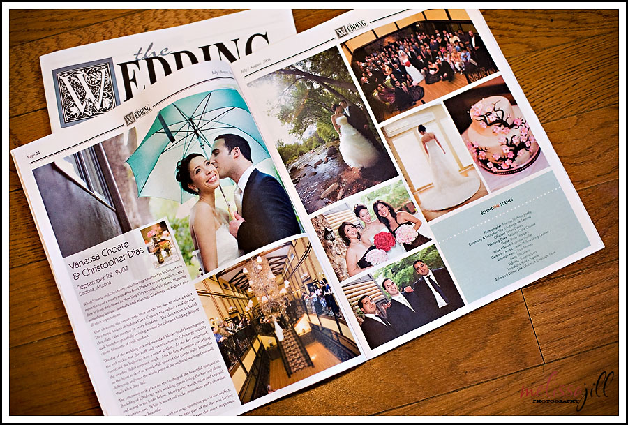 I just received the newest issue of The Wedding Chronicle, a local publication here in Phoenix, and opened it to find a full page spread featuring Chris & Vanessa's wedding! It was fun to look at the spread and relive the day. Chris & Vanessa are from New York and planned their destination wedding last September in Sedona. Unfortunately, it RAINED. I felt SO bad for them traveling all this way to enjoy the great outdoors and having to move the ceremony inside. Fortunately the clouds did part for us to get some amazing portraits of the two of them around the L'Auberge de Sedona property. And the ceremony in the lodge ended up having a very cozy, intimate feel. To see more images from this memorable wedding, click here.