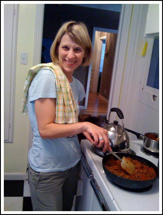 Here's the first photo I took with her--my friend Amy in her home in Modesto (where I'm staying for the next week or so) slaving away making dinner for us: