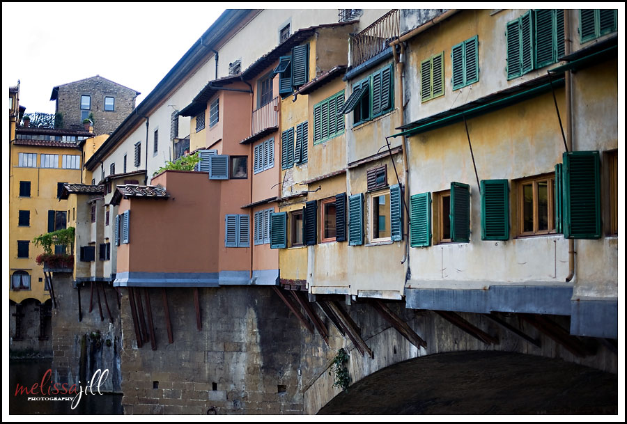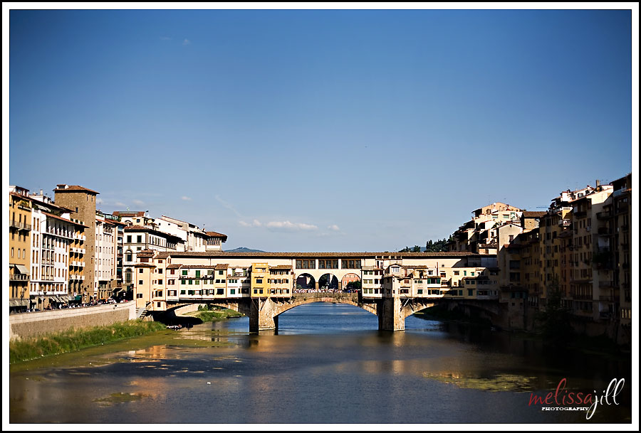 The Ponte Vecchio--Florence's only surviving bridge from medieval days. It is lined with shops selling jewelry.