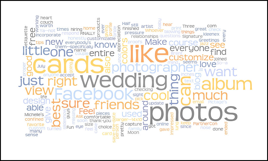 Do you ever get in a rut where you just love finding fun things to do that waste time? I guess the combination of being sick this week (I'm feeling better--thanks!) and being sucked into Facebook has me feeling extra lazy and unmotivated. Wait. I'm probably not supposed to admit that I ever feel like that since this is my professional blog--right? Ya, so I mean I'm always motivated and hard-working and I never goof off but when I was looking at Matt's blog (for work of course) I found this website where you can put in any URL and it will make a word collage of all the most commonly used words on it. You can play around and change the fonts and colors and all sorts of fun stuff. So the above is the result of putting my blog's URL in. Very Inn-tear-esting. Clearly I talk about photos, weddings and cards a lot. And apparently I'm a bit of a "like" valley girl :). Anyhow. Fun times.