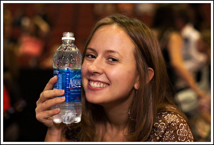 Tuesday night was the night and let me just say up front--it WAS fun. I had a good time. But I was a bit irritated as well. First of all--they made me give up my water bottle at the door. I know this is pretty normal but I've been to this venue a number of times before and remember one time in particular where they let me take it in. It stuck in my memory because I was pretty excited. This time, the guy at the door said they wanted me to buy their water. So, of course, I did. For 5 stinkin' dollars! (And believe me--I wasn't as happy about it as I was trying to appear in this photo.)