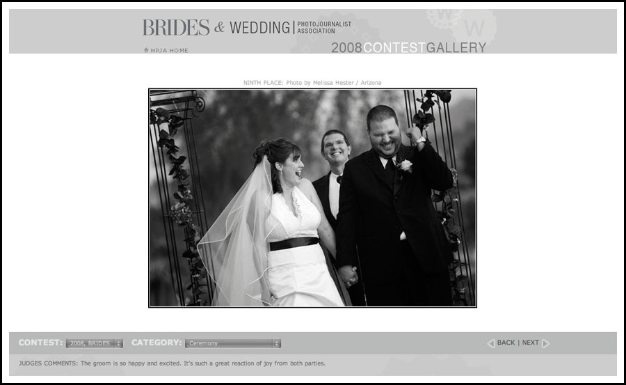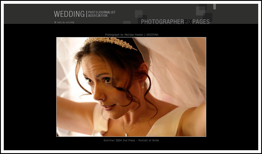 I have been a member of the Wedding Photojournalist Association for 4 years now. They hold quarterly photography contests that I faithfully enter every quarter. I won a 2nd place award in 2004 for this photo submitted in the "Portrait of a Bride" category:
