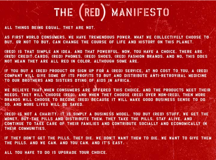 If you haven't heard what the (red) campaign is all about, it's a pretty great concept. Just by buying certain products, we can contribute to the saving of lives through aids medication for Africa. Here's the (red) manifesto: