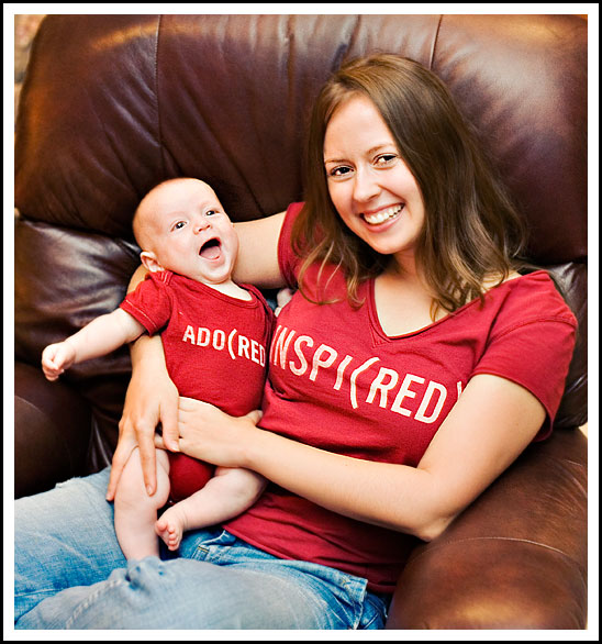 Anyhow, they had Tate dressed in this adorable onesie (sp?) from the (red) campaign. And I wore my (red) shirt too! We had to get a photo.