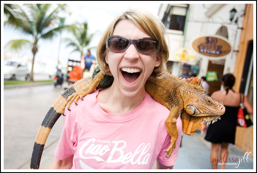 In just a few minutes I'm leaving for the airport to head to Modesto, CA to shoot my friend Amy's wedding on Saturday! I'm super-excited to see her again. Amy is one of my roommates from college and last year this time we were just getting back from a cruise around the Caribbean together. The above photo is one of my favorites from that trip. We were in Cozumel and Amy really enjoyed having a huge lizard on her shoulders as you can tell :). I probably won't have much time to blog while I'm there this weekend, but if you're like me and are now WISHING you were going on a cruise to the Caribbean, you can relive our trip here, here, here and here.