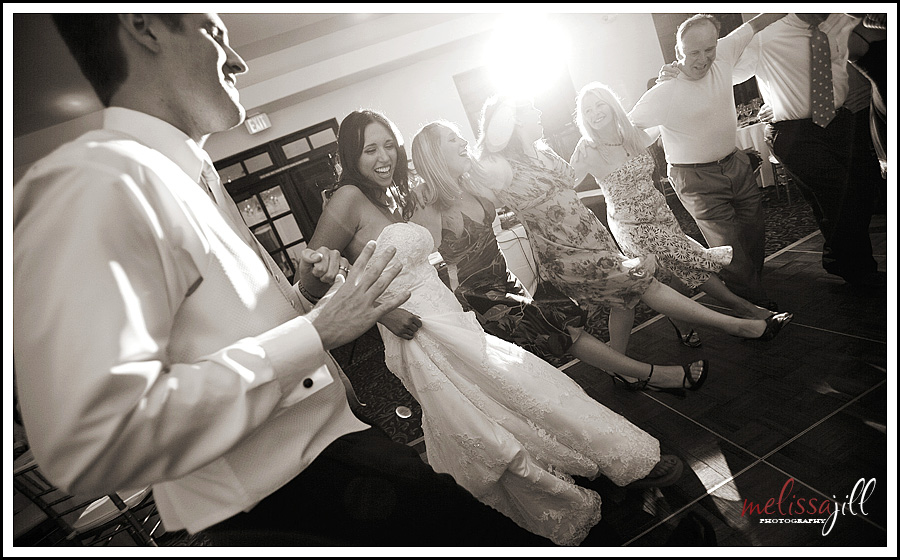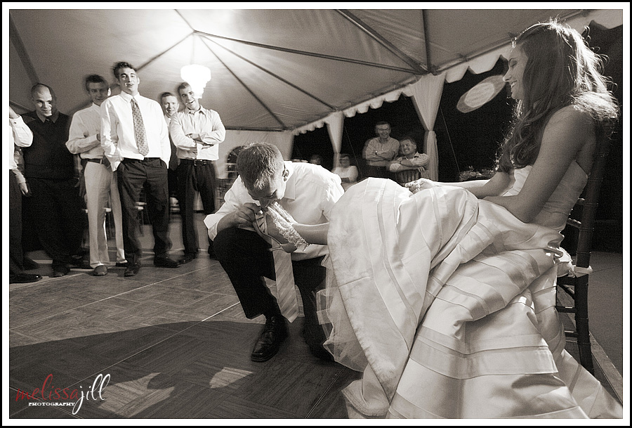 In this shot the lightstand with a 580EX attached to a pocket wizard and battery pack is off to the right behind the bride. You can see how the off-camera light illuminates the groomsmen in the background and backlights the subjects creating a greater sense of depth. This reception took place in a tent so the light was also able to bounce around and light up the whole scene in general.
