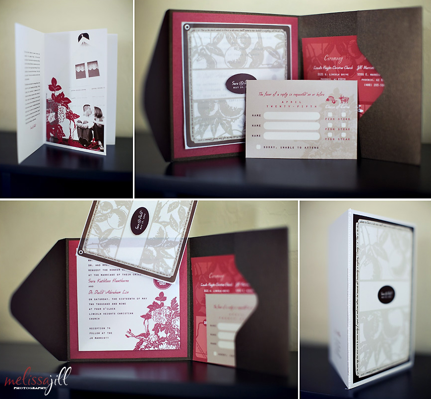 Sara is a graphic designer who is starting her own invitation design business called Red Seal Invitations. She did an AMAZING job on her own invitations and programs. She put so much work into the details right down to stitching the binding on the programs on her sewing machine! They truly are works of art. And it was fun to see one of their engagement photos cleverly integrated into the program as well!