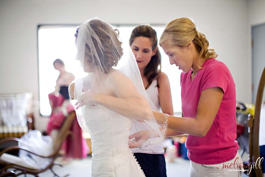 Sara getting into her dress with the help of her bridesmaids: