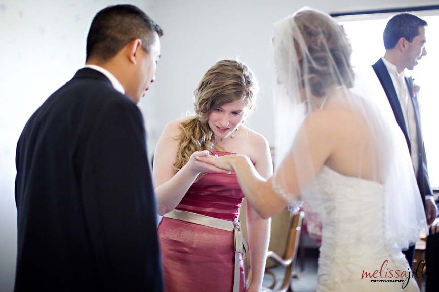 Sara's maid of honor admiring her ring after the ceremony: