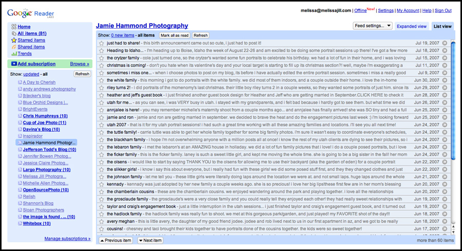 Most of you already use Google Reader or something like it, but it might surprise you to know that just this weekend I started using Google Reader to keep up on the blogs I like to follow. Previously I have just been checking each blog I like on my favorites list once in awhile to see if they're updated. But Google Reader is SO COOL! If anyone is stuck back in the stone-ages like I was, you need to check into it. In the above screen capture you can see what mine looks like. All you do is set up a free Google account and then add subscriptions to your Google Reader by pasting the URL into the subscription field. Then on the left hand side of your Google Reader you can see a list of all the blogs you subscribe to and whenever one is updated you can click on that blog entry and be taken to the post. It saves tons of time because you can just go to one place to catch up on all your blogs instead of looking at each one individually. I know most of you are already pros at this but I just thought I'd share in case there are others out there who are as behind as me :). And I'm teaching a seminar on blogging coming up so I should be the one who's on top of all this stuff! Shh--don't tell anyone...