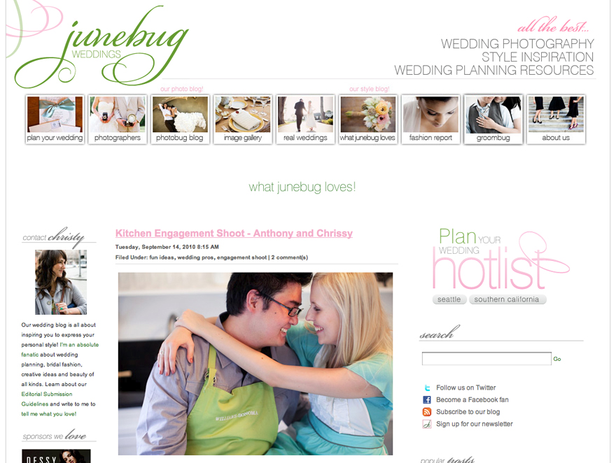 Remember Anthony & Chrissy's fun engagement session shot entirely in a kitchen? It is featured today on Junebug Weddings - a gorgeous wedding blog that just won the prestigious 2010 Aisle Dash Award for Best Wedding Web Site's Blog! Love Junebug and love this shoot! Check out the complete feature here!