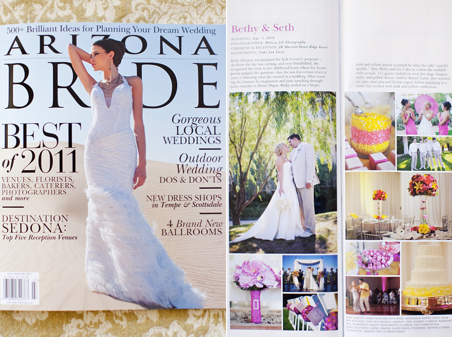I'm so excited! The new issue of Arizona Bride is out and Seth & Bethy's wedding is featured in it! These two were married last September at the JW Marriott Desert Ridge and had such fun, bright pink and yellow details. Congratulations to the team of vendors that helped to pull off this amazing wedding!